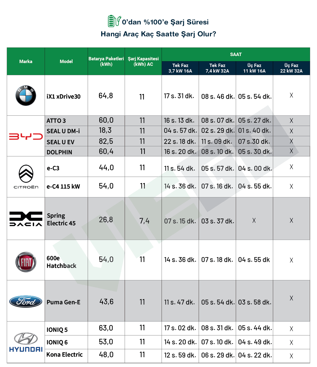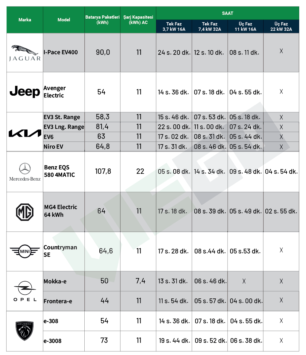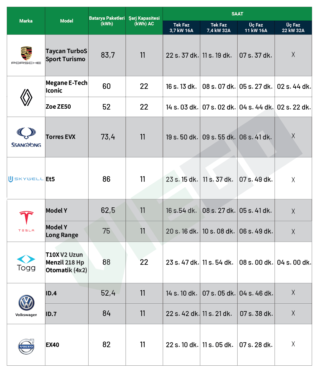 Elektrikli Araçların Modellere Göre Şarj Süreleri